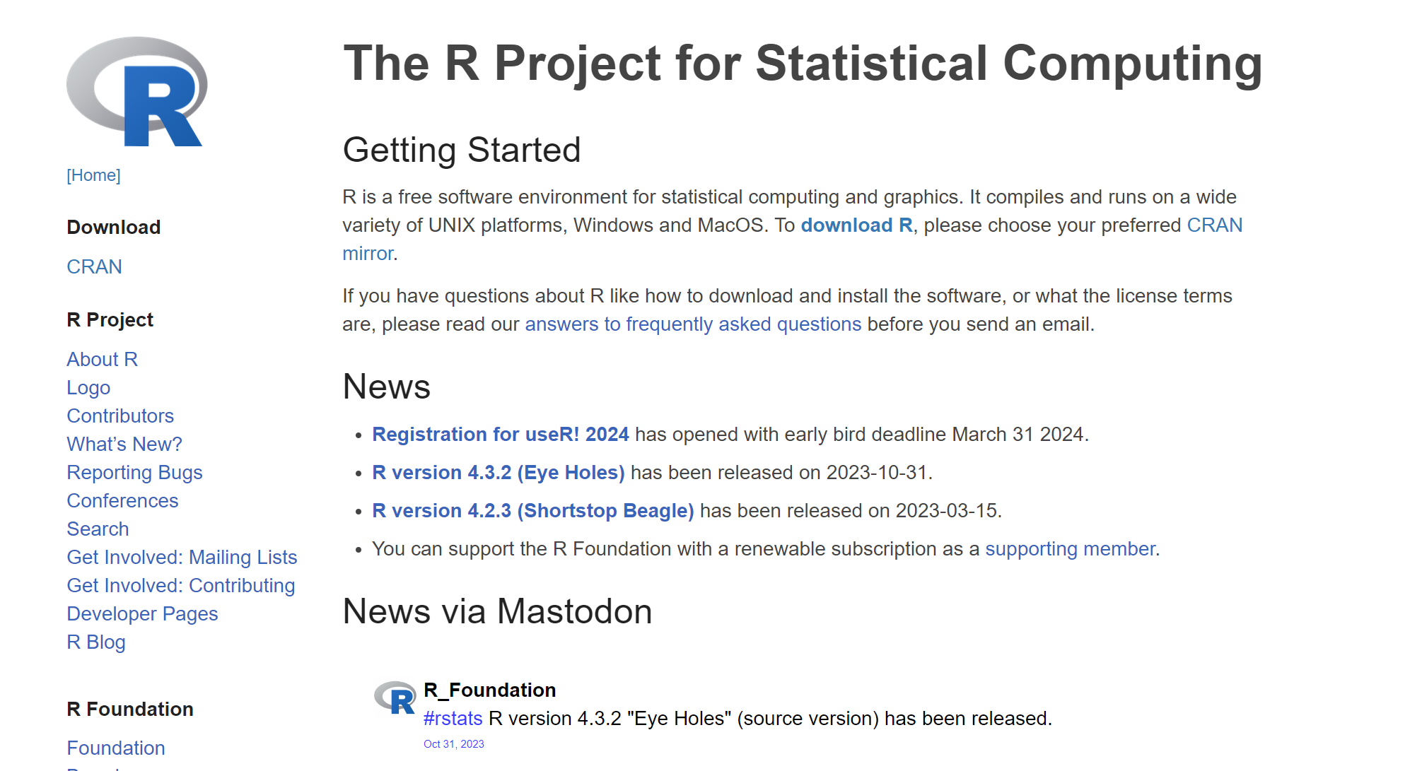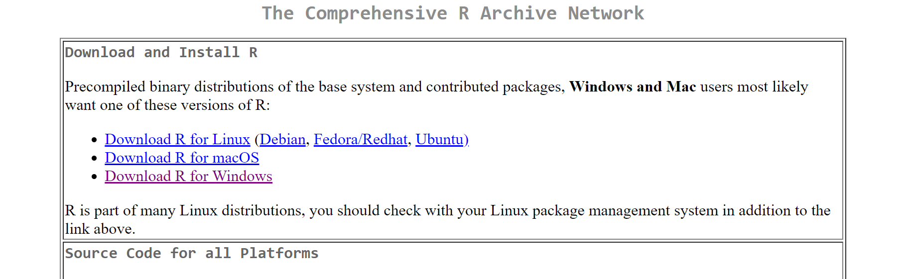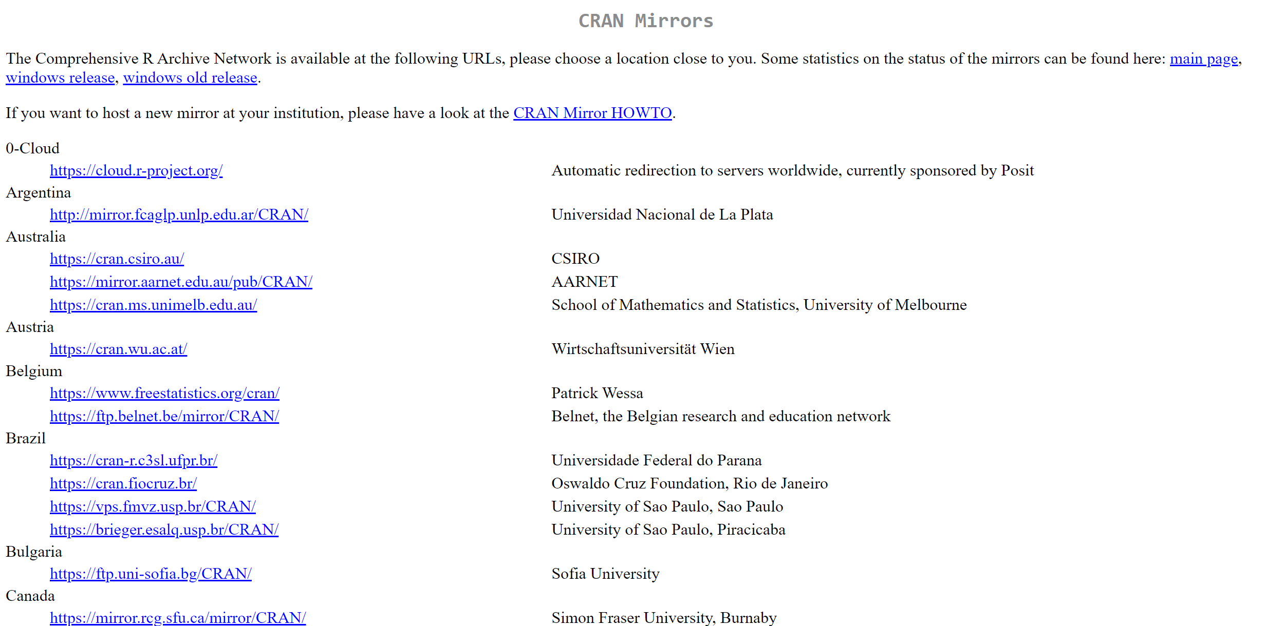 En el menú de la izquierda, pinche en Download -> CRAN y seleccione un mirror cualquiera (por ej: Chile https://cran.dcc.uchile.cl/)