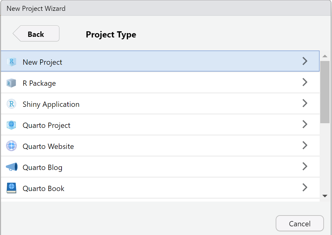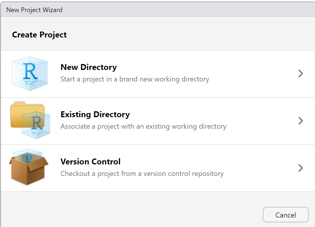 Para crear un proyecto, en RStudio iremos al menú File -> New Project... y se abrirá el siguiente cuadro: