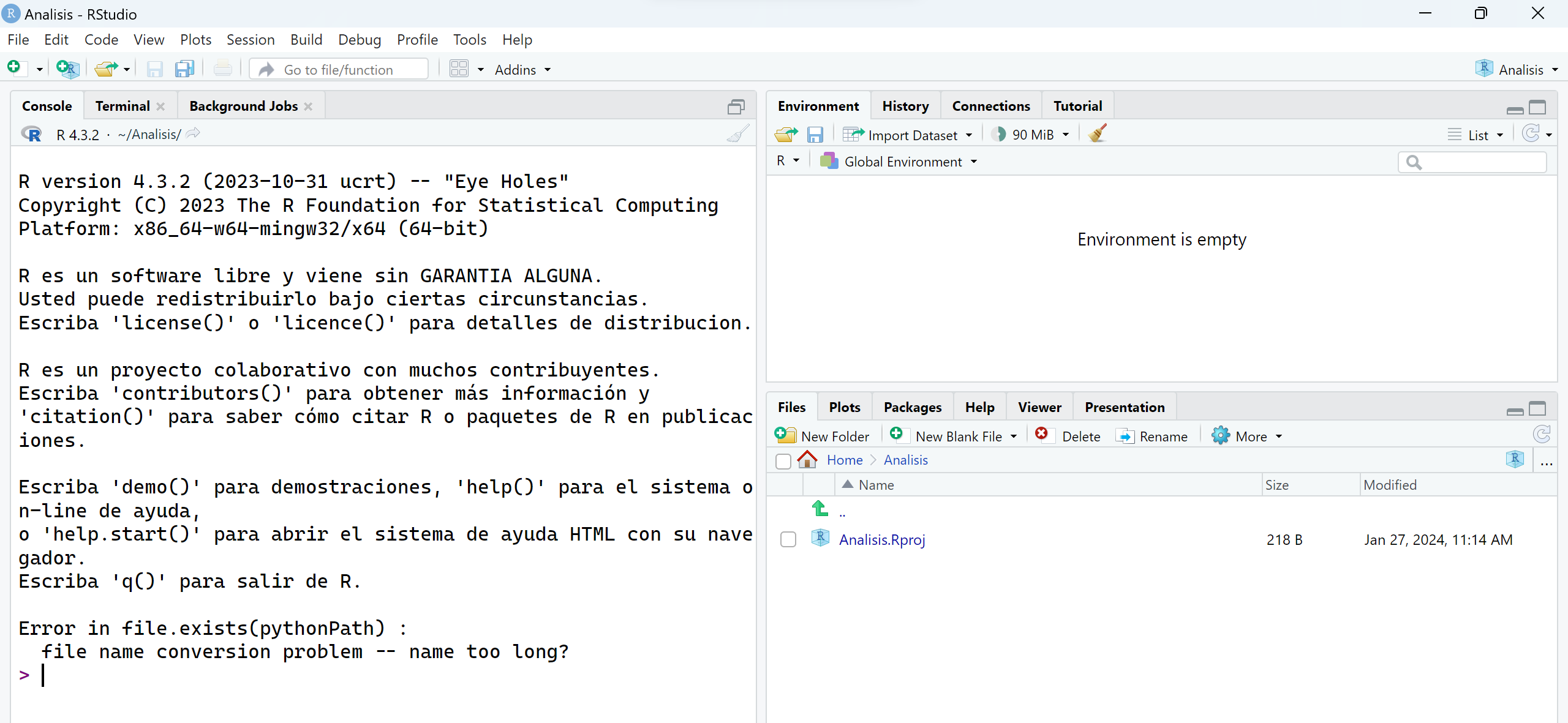 Si todo salió bien, se abrirá una nueva sesión de R con la carpeta del proyecto. Abajo a la derecha, en la pestaña File, aparecerá el archivo Analisis.Rproj (el nombre Analisis es un ejemplo solamente )