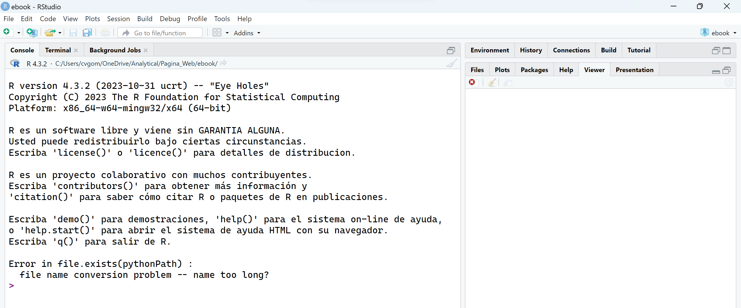 Una vez instalados ambos softwares, ejecute solamente el programa RStudio y se abrirá una pantalla similar a esta: