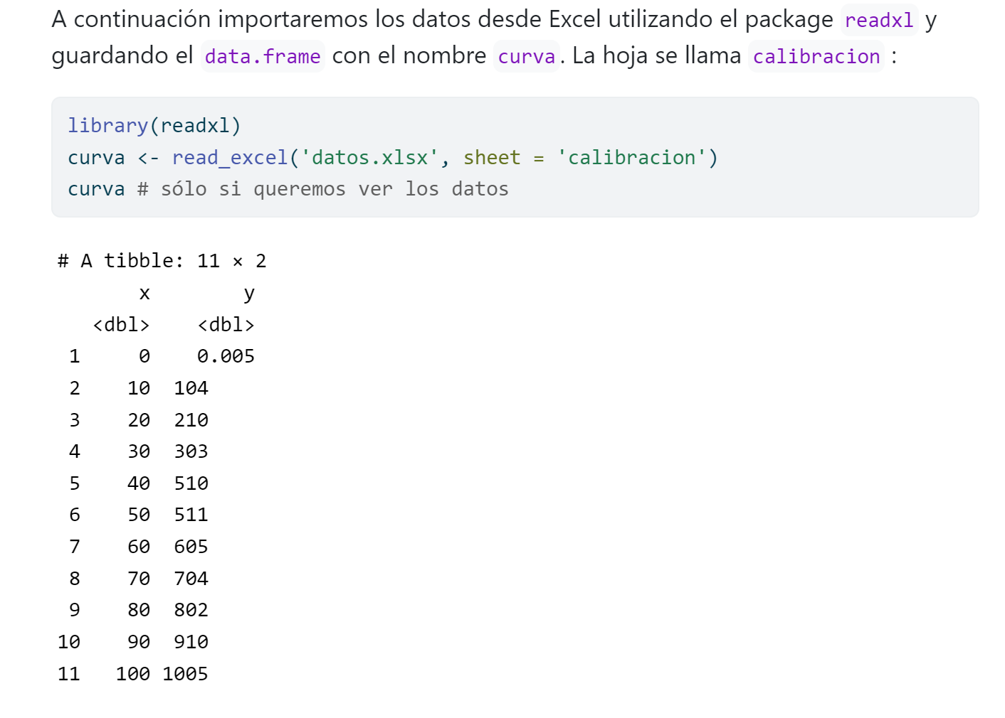 “A continuación importaremos los datos desde Excel utilizando el package readxl y guardando el data.frame con el nombre curva. La hoja se llama calibracion”