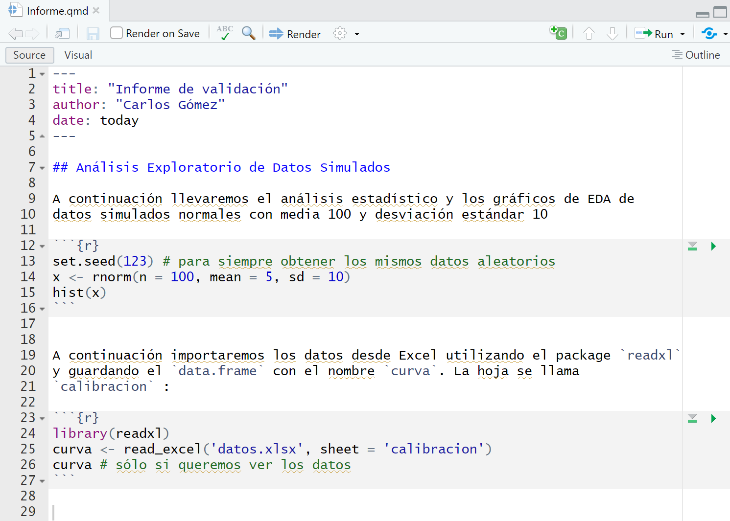 En las líneas 9 a la 11 hay un código en R que se ejecutará cuando se compila el documento. En este caso, también se mostrará el código en el documento final: