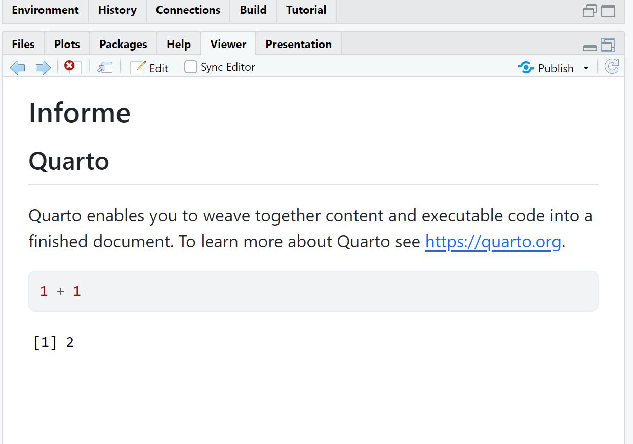 Cuando se cree el proyecto se abrirá una nueva sesión de R y aparecerá un script pero ahora con extensión .qmd y que quedrá guardado en la carpeta del proyecto que llamamos Informe: