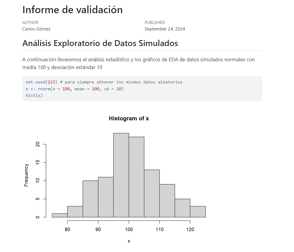 En un mismo documento escribimos nuestro texto y el código R para los análisis estadísticos. Compilamos y automáticamente Quarto genera el documento de salida mezclando texto, código, tablas, gráficos, etc. Si cambiamos los datos, se actualiza todo. Veamos un ejemplo: