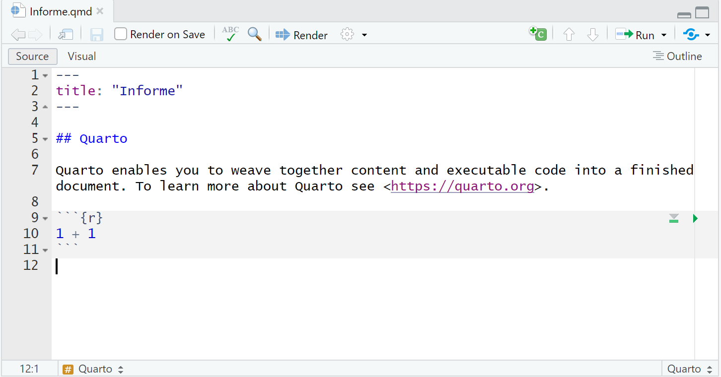 Ahora su archivo informe.qmd debe verse algo similar a esto (no es necesario que coincidan los números de líneas a la izquierda):