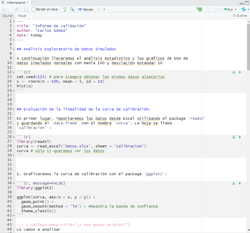 No se preocupe, Quarto actualizará en forma automática todos los análisis estadísticos, las tablas, los p-values, los gráficos, el test de linealidad, la incertidumbre de calibración, las secciones y los capítulos del informe… todo… hasta las referencias blibliográficas.