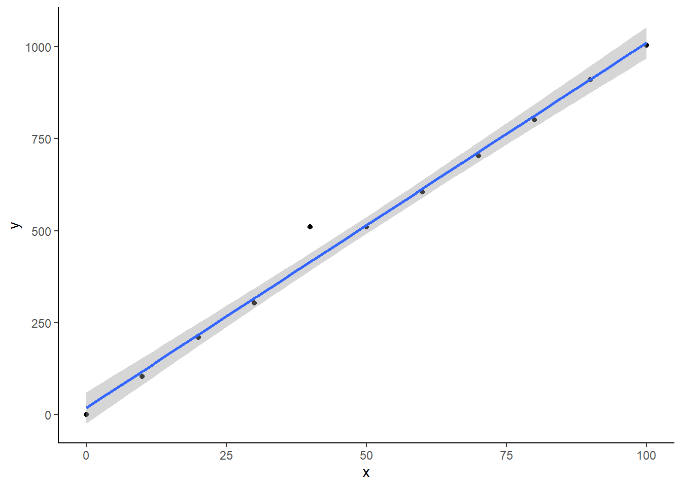Mmmm… interesante. Aún con el dato outlier, aparentemente, el modelo lineal tiene un buen ajuste (piense: ¿en qué zona de la curva está ubicado el outlier?)