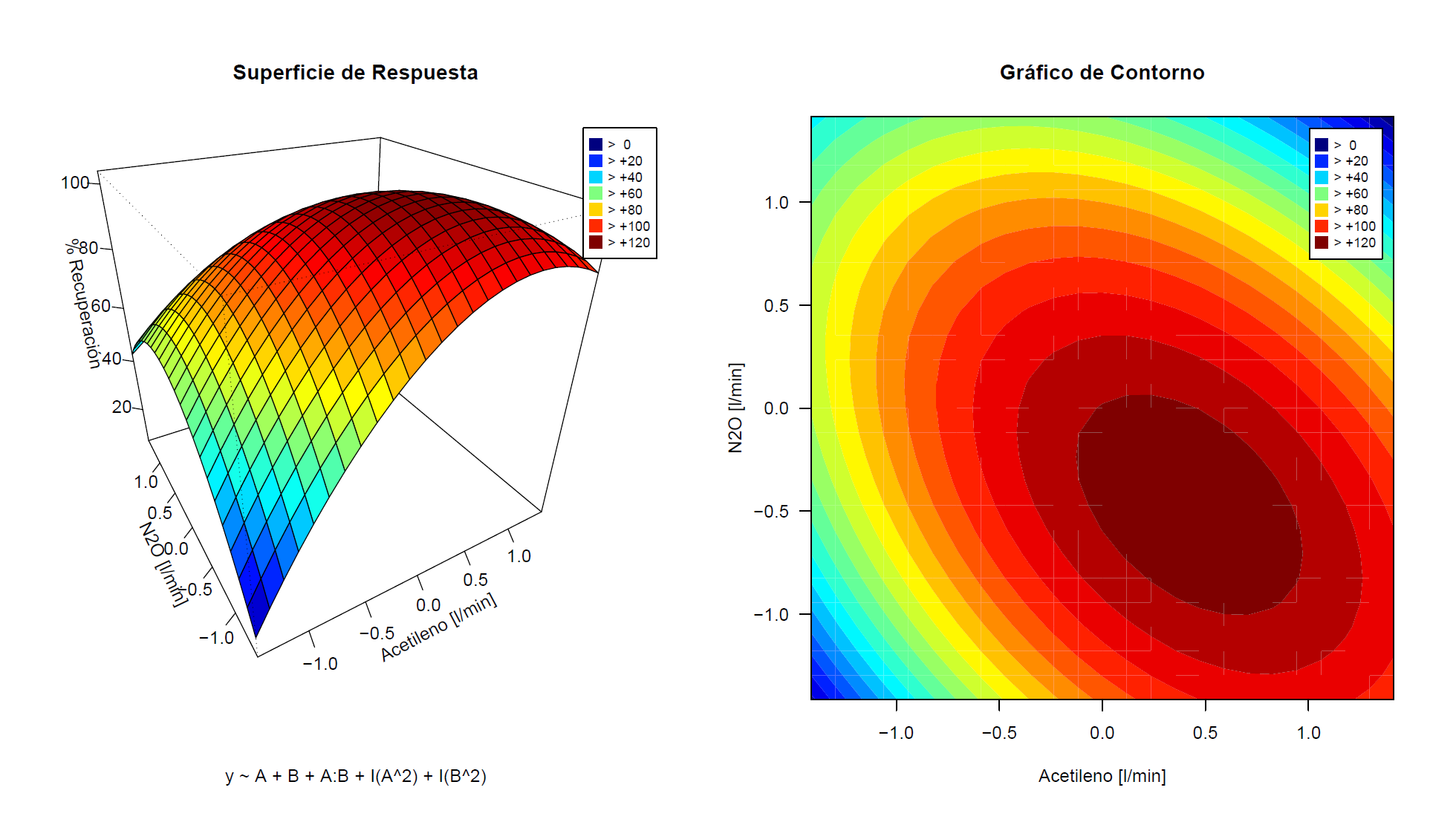 Una excelente herramienta para aplicar en estos casos es el Diseño de Experimentos, especialmente la metodología de superficie de respuesta (RSM). La siguiente figura (izq) es un caso real, que describe la optimización del % de recuperación de un método variando 2 factores: Flujo de acetileno y el flujo de N2O del AAS.